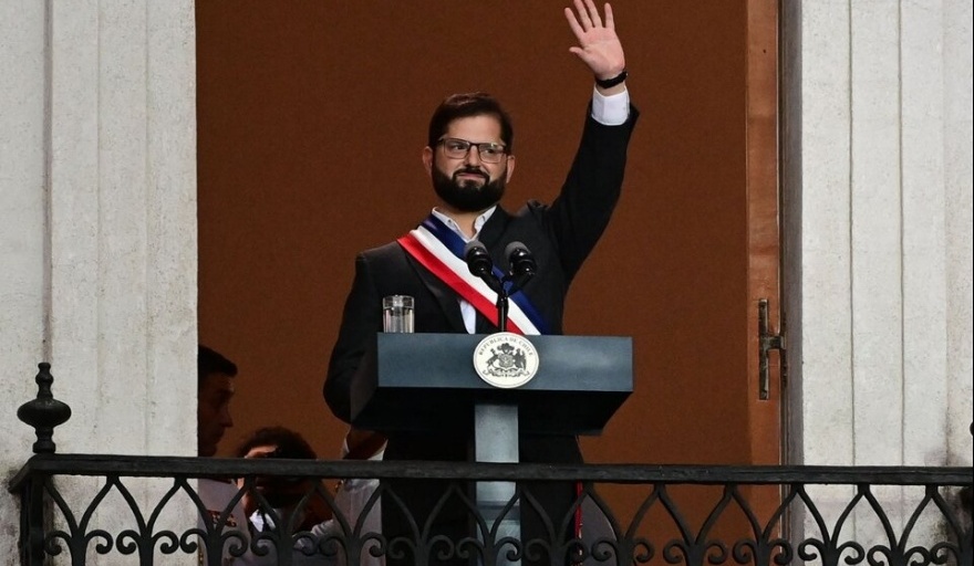 Ante un plenario que lo ovacionaba de pie, el flamante jefe de Estado -visiblemente emocionado- recibió con una sonrisa la banda presidencial y la mítica piocha de O'Higgins -símbolos del traspaso de poder- de manos del presidente del Senado, el socialista Álvaro Elizalde, y del mandatario saliente, el conservador Sebastián Piñera, respectivamente.