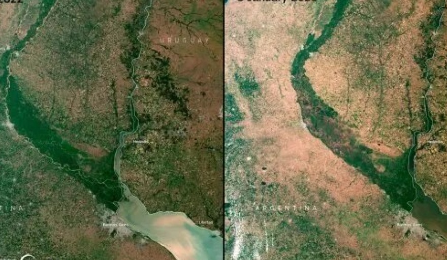"Continúa la preocupante sequía en Sudamérica. La agricultura se ve muy afectada y la cosecha podría caer un 50% en Argentina en 2023", cita el posteo, en el que se observa la cuenca del río Paraná en enero 2022 y enero 2023, visto por el satélite Sentinel3.