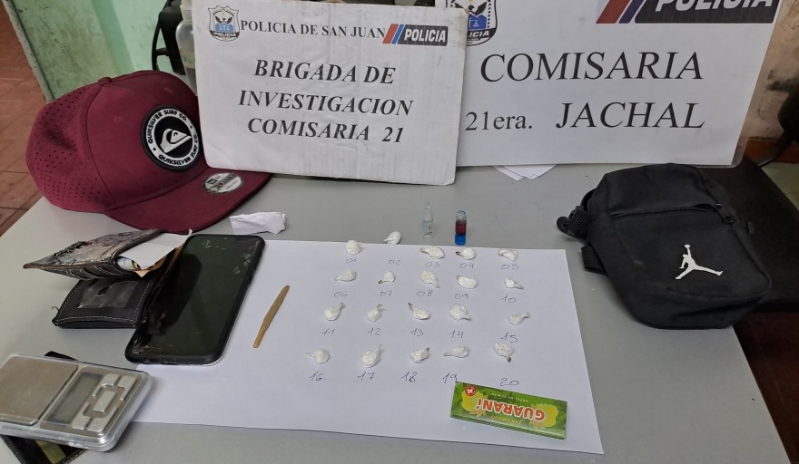 El joven fue detenido y puesto a disposición de la Justicia federal por infringir la Ley de Estupefacientes N° 23.737, quedando demorado en la sede policial de la Comisaría 21 a disposición del Juzgado de Paz de Jáchal, por infracción a la ley 941-R.