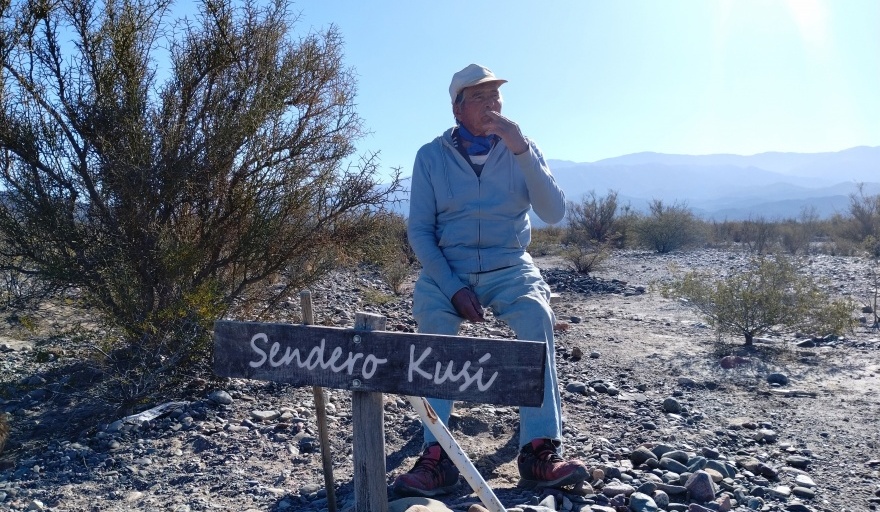 Más tarde, don Juan nos guió por un sendero que él mismo diagramó, conduciendo hacia un tramo del Río Jáchal que se encuentra cerca de su hogar. Este camino está adornado con carteles explicativos y diversas plantas arbustivas, muchas de ellas consideradas sagradas por los pueblos originarios. "Cada planta tiene un significado y un propósito. Estas arbustivas no solo embellecen el paisaje, sino que también son parte de nuestra herencia cultural", explicó mientras señalaba algunas de las especies más destacadas.