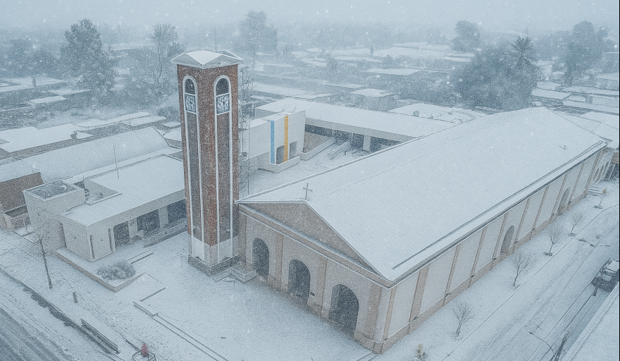 En un invierno que no da tregua y con temperaturas extremas que vienen afectando a buena parte del país, la inteligencia artificial también quiso decir presente en Jáchal. A través de una simulación visual, se generó una imagen del Santuario Arquidiocesano San José cubierto de un manto blanco, como si la nieve hubiera llegado hasta el corazón religioso y arquitectónico del departamento.