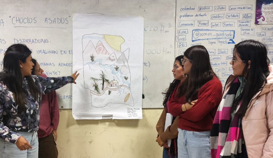El primer encuentro, realizado el 10 de junio, reunió a estudiantes de la asignatura Geología Regional, docentes de la FCEFN y talleristas del equipo interdisciplinario. Allí se presentaron los lineamientos de la propuesta, se activaron saberes previos y se invitó a pensar el territorio desde una mirada situada. Hubo encuestas, juegos de presentación y una lectura colectiva del cuento Choclos Asados de Mingo de Jáchal, que dio pie a iconografías, reflexiones y mapeos expresivos sobre ambiente, patrimonio y geología.