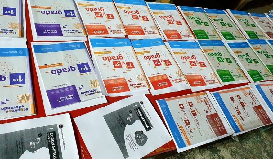 El miércoles de la semana pasada llegaron a la provincia los cuadernillos enviados por Nación. Tras la desinfección del cargamento las directoras de Nivel y personal mínimo afectado, siguiendo el protocolo sanitario trabajaron el fin de semana largo, clasificando y dividiendo por Nivel Inicial, Primario y Secundario, los cuadernillos nacionales a los que se les adjuntaron las guías locales ,y un instructivo sobre las medidas de prevención sanitaria contra el COVID-19.