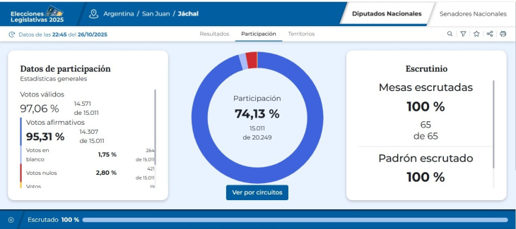 De acuerdo a los datos oficiales, participaron 15.011 jachalleros, lo que representa el 74,13% del padrón electoral, compuesto por 20.249 electores habilitados para emitir su voto. La jornada electoral transcurrió con normalidad en todo el departamento, sin mayores incidentes reportados en las escuelas designadas como centros de votación.