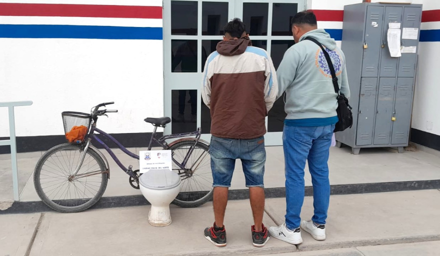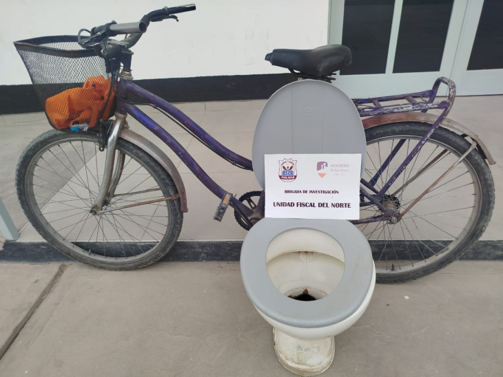 Este lunes, minutos después de las 11 de la mañana, personal de la UFI del Norte protagonizó un procedimiento en Avenida Santiago Funes, antes de llegar a calle Florida, cuando los efectivos interceptaron a un hombre que circulaba en una bicicleta tipo paseo de color morado con un canasto delantero. Lo llamativo era la carga que transportaba: un inodoro de porcelanato blanco marca Ferrum con tapa plástica gris.