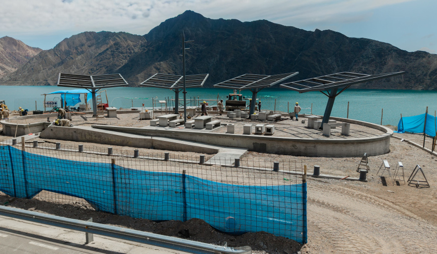 La obra del Mirador Nº 5 se encuentra próxima a ser completada, el espacio cuenta con mobiliario completo, parasoles metálicos con iluminación LED integrada, estación solar para carga de celulares, inflador solar para bicicletas, barandas, cartelería retroiluminada y estacionamiento pavimentado. Se están ejecutando las correcciones finales y la limpieza de obra.