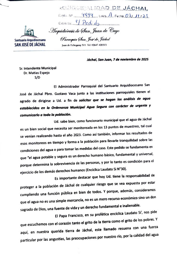 Este viernes 7 de noviembre, el Administrador Parroquial del Santuario Arquidiocesano San José de Jáchal, presbítero Gustavo Vaca, junto con las instituciones parroquiales, presentó un expediente formal en la Municipalidad de Jáchal (Expediente N° 4994 A) dirigido al intendente Matías Espejo, solicitando que se cumpla con la Ordenanza Municipal “Agua Segura”, que establece la obligación de realizar controles periódicos y transparentes sobre la calidad del agua.