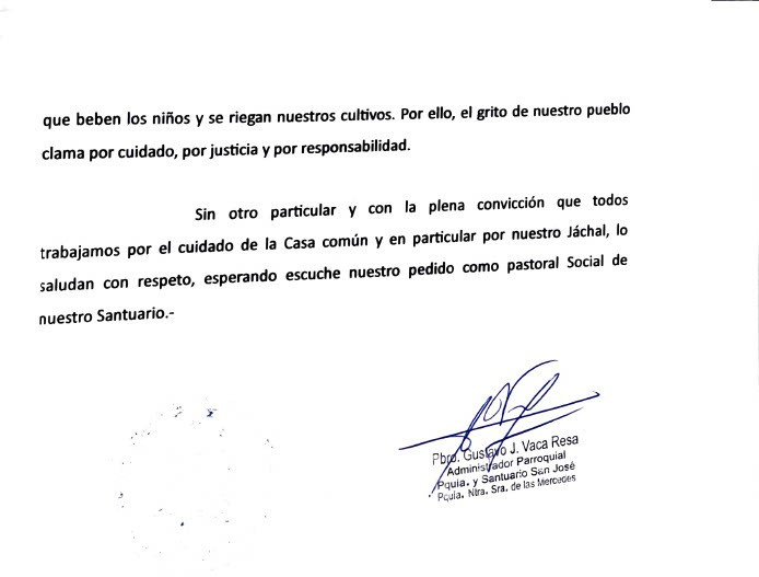 En su cierre, la presentación dirigida al Ejecutivo municipal deja un mensaje contundente y esperanzador: “El grito de nuestro pueblo clama por cuidado, por justicia y por responsabilidad. Con la plena convicción de que todos trabajamos por el cuidado de la Casa Común y en particular por nuestro Jáchal, lo saludamos con respeto, esperando escuche nuestro pedido”.