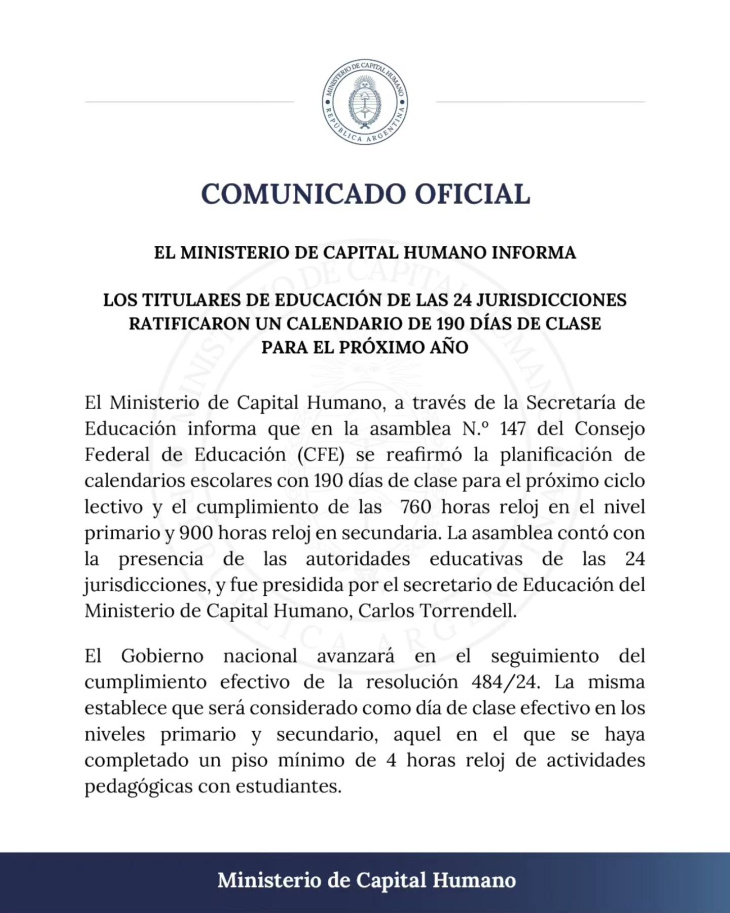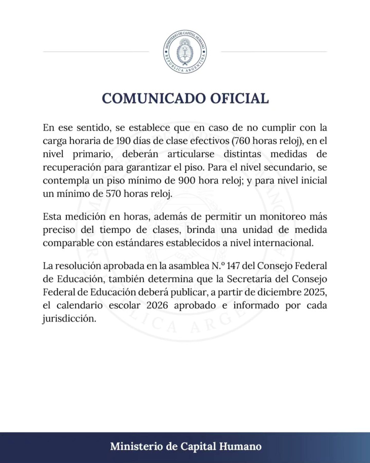 "Se establece que en caso de no cumplir con la carga horaria de 190 días de clase efectivos (760 horas reloj), en el nivel primario, deberán articularse distintas medidas de recuperación para garantizar el piso. Para el nivel secundario, se contempla un piso mínimo de 900 hora reloj; y para nivel inicial un mínimo de 570 horas reloj", puntualizaron desde el Ministerio de Capital Humano.