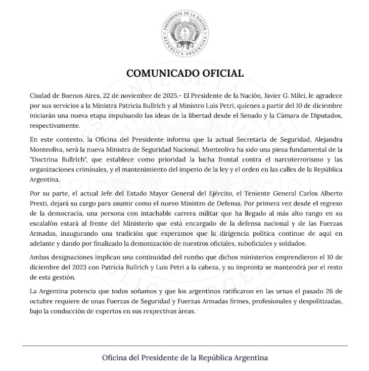 En simultáneo, la decisión fue comunicada por Bullrich, Petri y la Oficina del Presidente en la red social X. “El Presidente de la Nación, Javier G. Milei, le agradece por sus servicios a la Ministra Patricia Bullrich y al Ministro Luis Petri, quienes a partir del 10 de diciembre iniciarán una nueva etapa impulsando las ideas de la libertad desde el Senado y la Cámara de Diputados”, comienza el comunicado, en el que el Gobierno asegura que “ambas designaciones implican una continuidad del rumbo”.