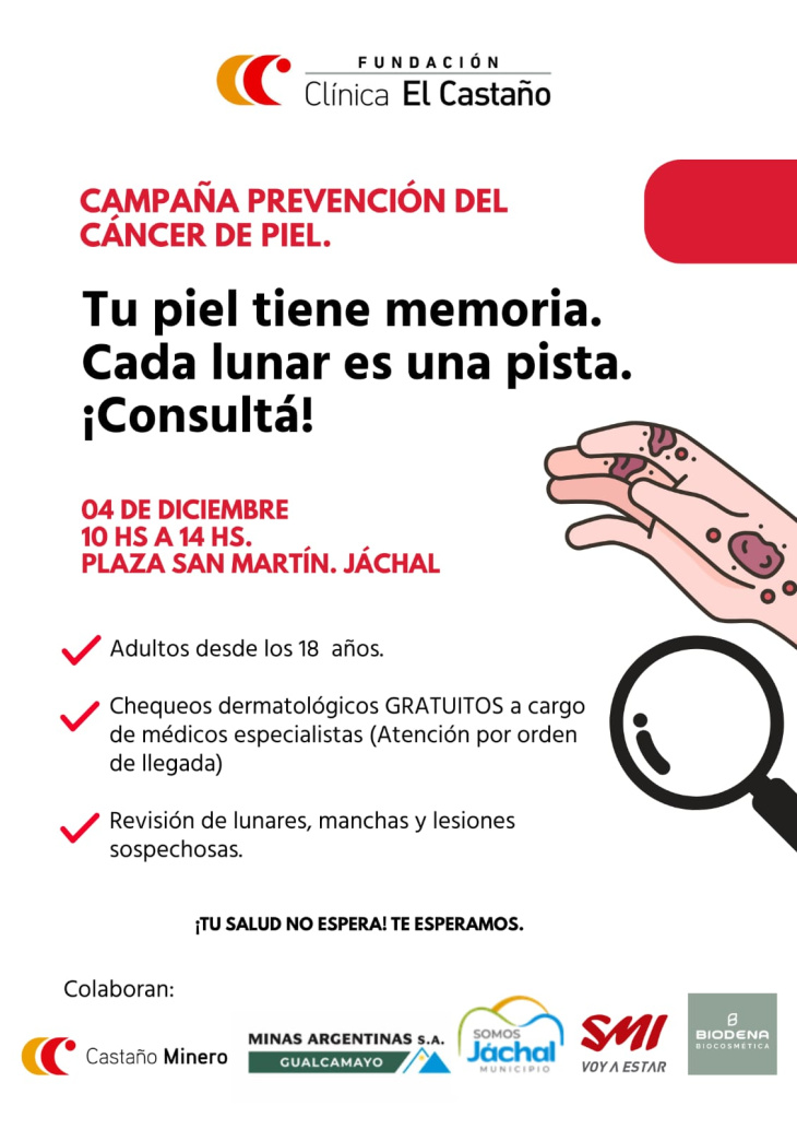 Se trata de una acción conjunta que busca reforzar el acceso a la salud y promover la detección temprana de enfermedades cutáneas, este jueves 4 de diciembre se llevará adelante en Jáchal una campaña gratuita de prevención del cáncer de piel. La jornada se realizará en la Plaza General San Martín y estará destinada a todas las personas mayores de 18 años que deseen hacerse un control básico de su piel.