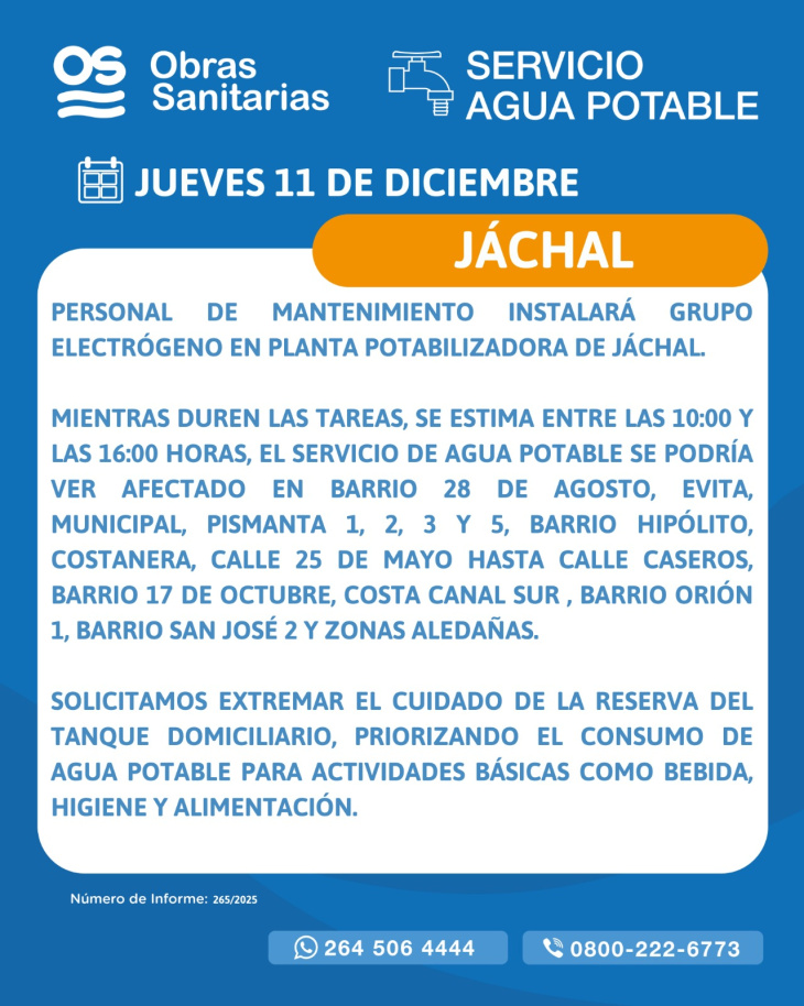 Desde la empresa remarcaron que la incorporación de este grupo electrógeno representa una mejora significativa para todo el departamento, ya que permitirá sostener la actividad de las bombas aun cuando se produzcan cortes energéticos, una situación frecuente durante episodios de fuertes vientos, temporal y diferentes adversidades. Mientras tanto, solicitaron a los usuarios de las zonas mencionadas hacer un uso responsable y restringido del agua durante el horario de trabajo, para minimizar el impacto en los hogares.