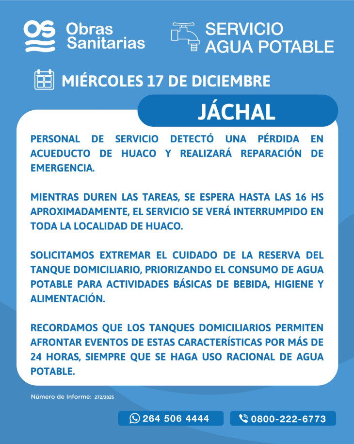 Según se informó oficialmente, mientras se desarrollen las tareas técnicas necesarias para solucionar el inconveniente, el servicio de agua potable se verá interrumpido en toda la localidad de Huaco, estimándose que la normalización podría concretarse alrededor de las 16 horas, siempre y cuando las condiciones de trabajo lo permitan y no surjan nuevas complicaciones durante la intervención.