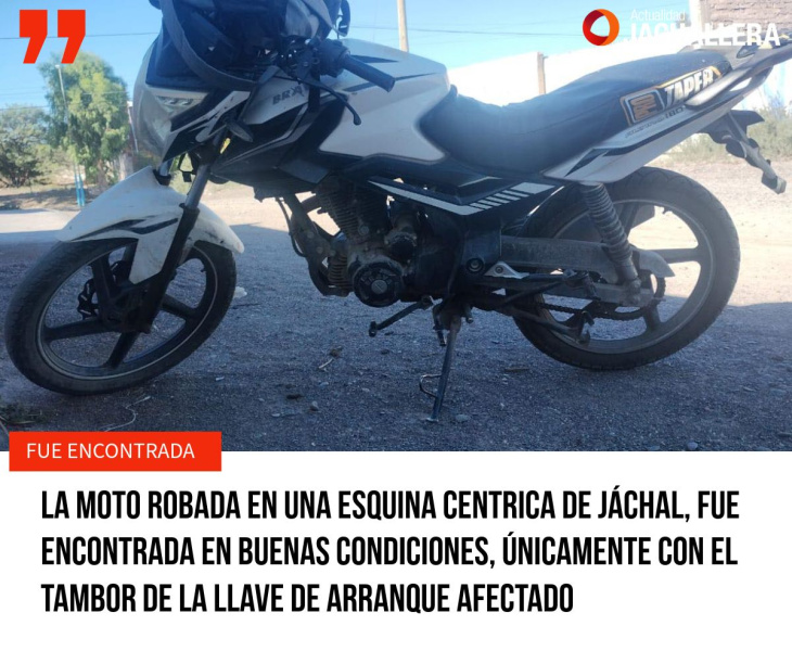Luego su propietario se comunicó con Actualidad Jachallera y confirmó que la moto fue encontrada en buenas condiciones en calle General Paz- pasando Mariano Ianelli, excepto el tambor de la llave de arranque.