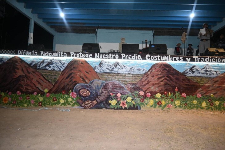 Uno de los momentos más emotivos de la noche fue el homenaje a la querida y recordada Pascualita, que despertó un profundo sentimiento en la comunidad. Al pie del escenario principal, el artista Erick Muñoz realizó una pintura en su honor, una obra cargada de sensibilidad que acompañó el recuerdo y el reconocimiento de quienes mantienen viva la memoria colectiva del pueblo.