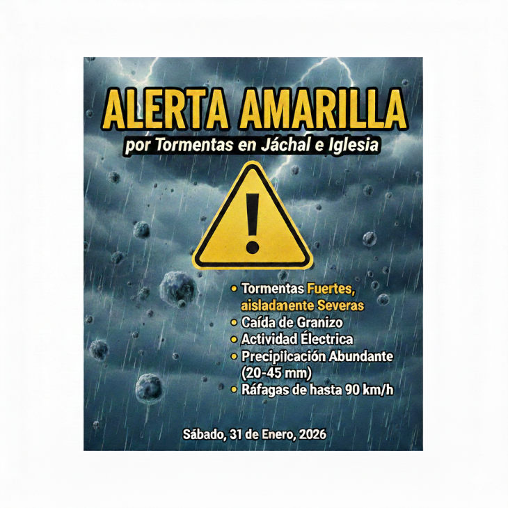 El Servicio Meteorológico Nacional (SMN) emitió un alerta amarilla por tormentas para la Precordillera de Jáchal e Iglesia, pronosticando un escenario climático inestable y de riesgo moderado que se extenderá desde la tarde de este sábado 31 de enero hasta la mañana del domingo 1 de febrero.