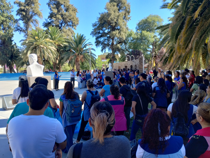 En Jáchal, el reclamo se hizo visible desde temprano. A las 9 de la mañana, un importante grupo de docentes se reunió en la Plaza General San Martín. Allí llevaron adelante una asamblea abierta, en la que intercambiaron posturas sobre la situación salarial.