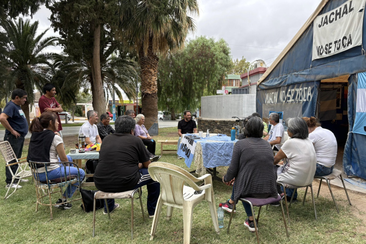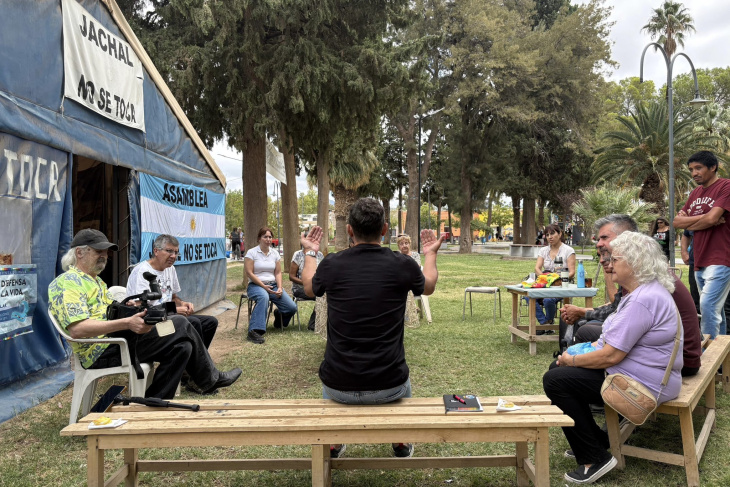 La reunión se llevó a cabo el sábado 14 de marzo por la mañana, en un espacio cargado de simbolismo para el movimiento ambiental jachallero: la carpa que representa la lucha y resistencia de la asamblea, un punto de encuentro histórico para vecinos que desde hace años sostienen el reclamo por el cuidado del agua y del ambiente.