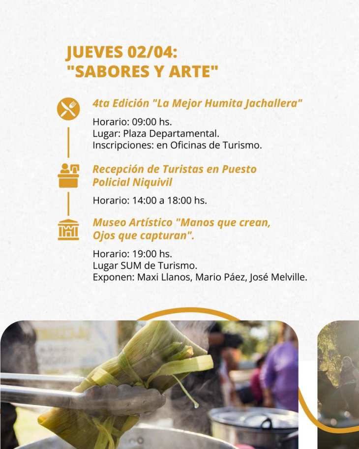 La programación comenzará el jueves 2 de abril con una jornada que tendrá como eje los sabores y el arte local. Desde las 9 de la mañana, la Plaza Departamental será el escenario de la cuarta edición de “La Mejor Humita Jachallera”, un clásico que revaloriza la gastronomía local y convoca a cocineros y familias a compartir una de las recetas más representativas del lugar. Las inscripciones se encuentran disponibles en las oficinas de turismo.