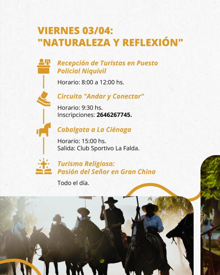 El viernes 3 de abril estará atravesado por la conexión con la naturaleza y la reflexión espiritual. Desde las primeras horas del día, entre las 8 y las 12, continuará la recepción de turistas en Niquivil. A las 9:30 se desarrollará el circuito “Andar y Conectar”, una propuesta pensada para experimentar el contacto con el entorno natural, con inscripciones disponibles al número 2646267745.