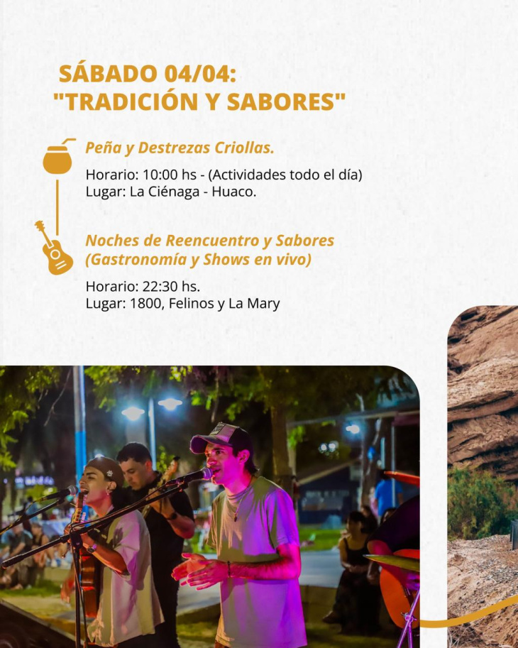 El sábado 4 de abril estará marcado por las raíces culturales y el encuentro. Desde las 10 de la mañana, en La Ciénega – Huaco, se llevará adelante una jornada de peña y destrezas criollas con actividades durante todo el día, donde la música, la danza y las tradiciones gauchas serán protagonistas. Por la noche, a partir de las 22:30, la propuesta “Noches de Reencuentro y Sabores” ofrecerá gastronomía y shows en vivo en distintos espacios como 1800, Felinos y La Mary, generando un ambiente festivo para disfrutar entre amigos y en familia.