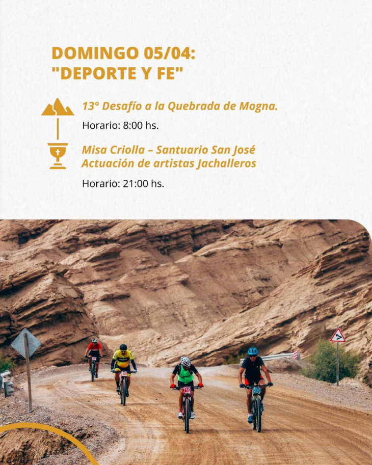 El cierre llegará el domingo 5 de abril, con una combinación de deporte y espiritualidad. A las 8 de la mañana se pondrá en marcha el 13° Desafío a la Quebrada de Mogna, una competencia que convoca a deportistas y amantes de la aventura en un entorno natural imponente. Por la noche, a las 21 horas, el Santuario San José será escenario de la Misa Criolla, con la participación de artistas jachalleros, en un final que promete emoción, fe y cultura.