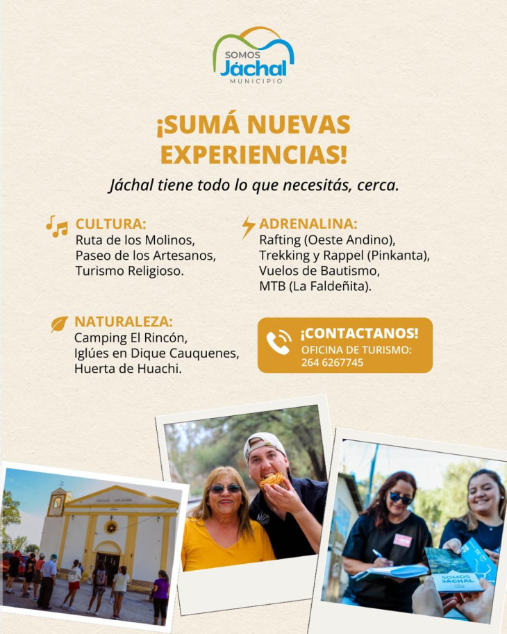 Pero la propuesta no termina allí. Jáchal invita a quienes visiten el departamento a ampliar su experiencia durante toda la estadía. Entre las opciones culturales se destacan la Ruta de los Molinos, el Paseo de los Artesanos y el turismo religioso. Para los más aventureros, hay alternativas como rafting en el Oeste Andino, trekking y rappel en Pinkanta, vuelos de bautismo y mountain bike en La Faldeñita. En materia de naturaleza, se pueden disfrutar espacios como el Camping El Rincón, los iglúes en el Dique Cauquenes y la Huerta de Huachi.
