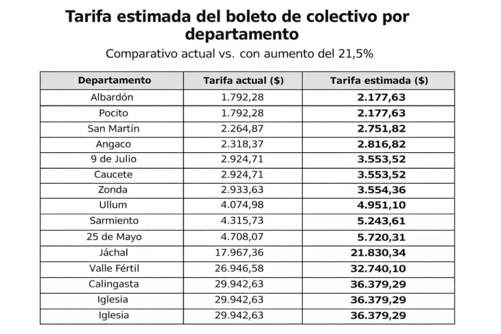 De acuerdo a estas estimaciones, los viajes hacia Albardón y Pocito pasarían de $1.792,28 a aproximadamente $2.177,63. En tanto, para quienes se trasladan a San Martín, el boleto subiría de $2.264,87 a unos $2.751,82, mientras que en el caso de Angaco, el valor escalaría de $2.318,37 a cerca de $2.816,82.