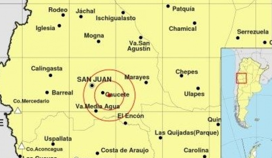 El epicentro se registró a 41 km de la Ciudad de San Juan, más precisamente en el departamento Caucete a 14 Km al sudeste de la villa cabecera. Tuvo una profundidad de 118 km.
